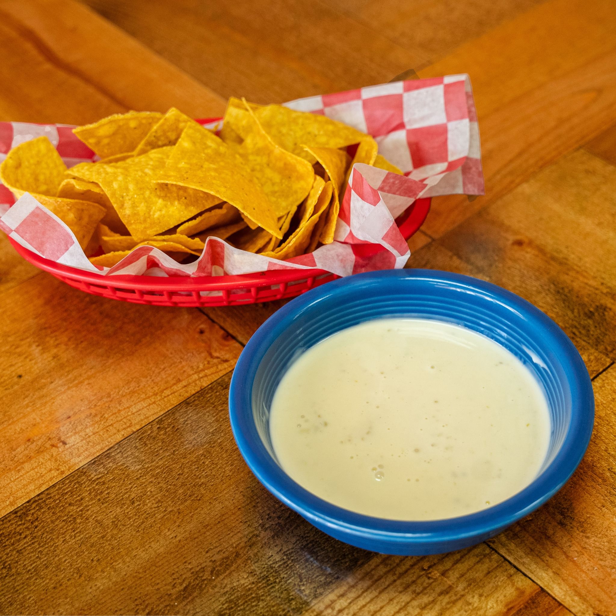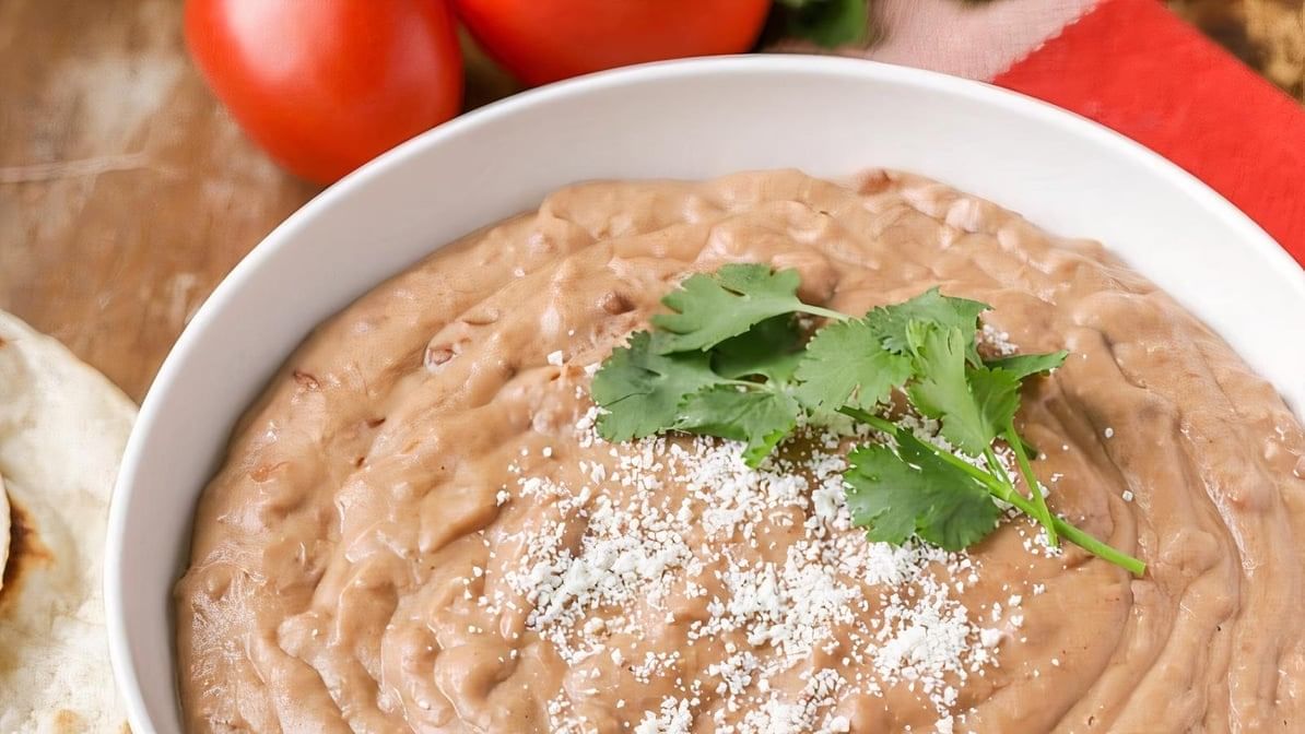 Refried beans topped with queso dip