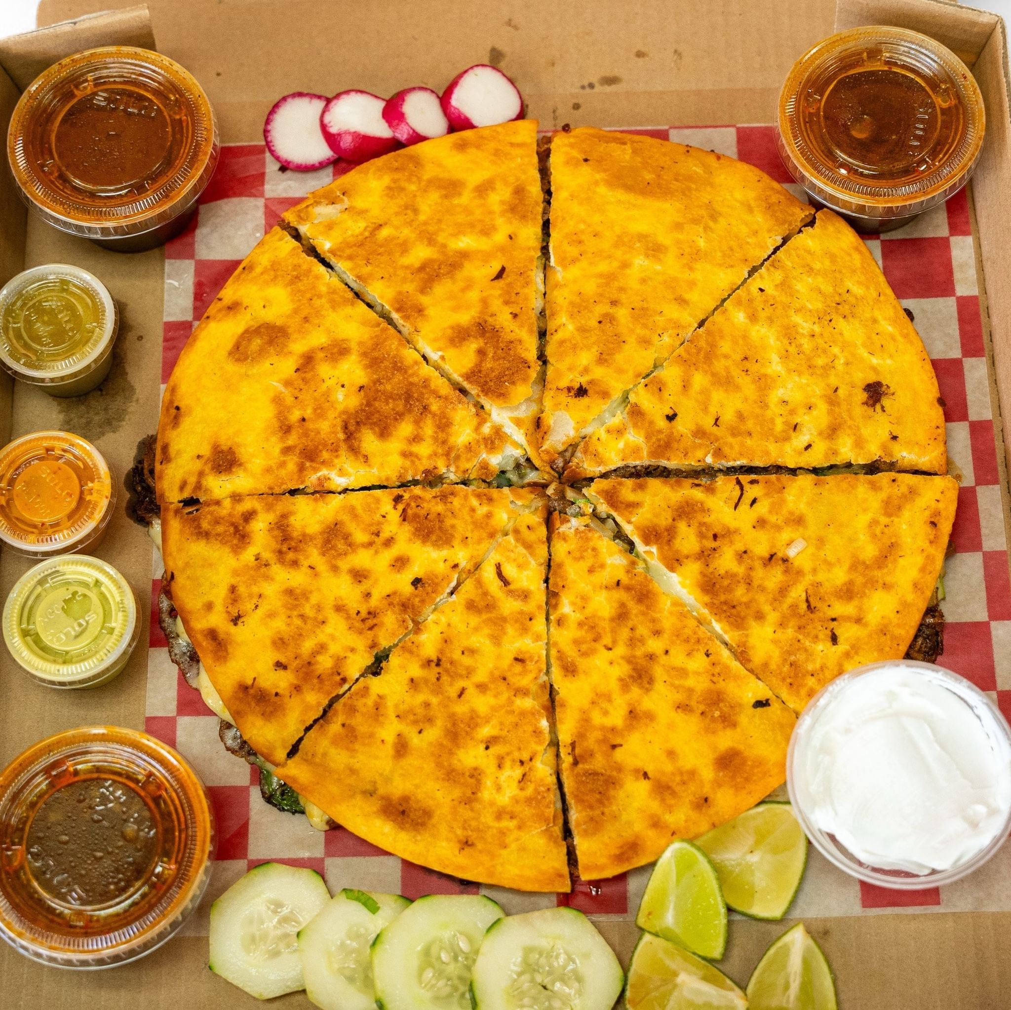 Two 12" flour tortillas made in pizza form dipped in beef broth filled with birria, cheese, onion, and cilantro, cut into 8 slices, topped with sour cream. Served with broth, limes, and hot sauce