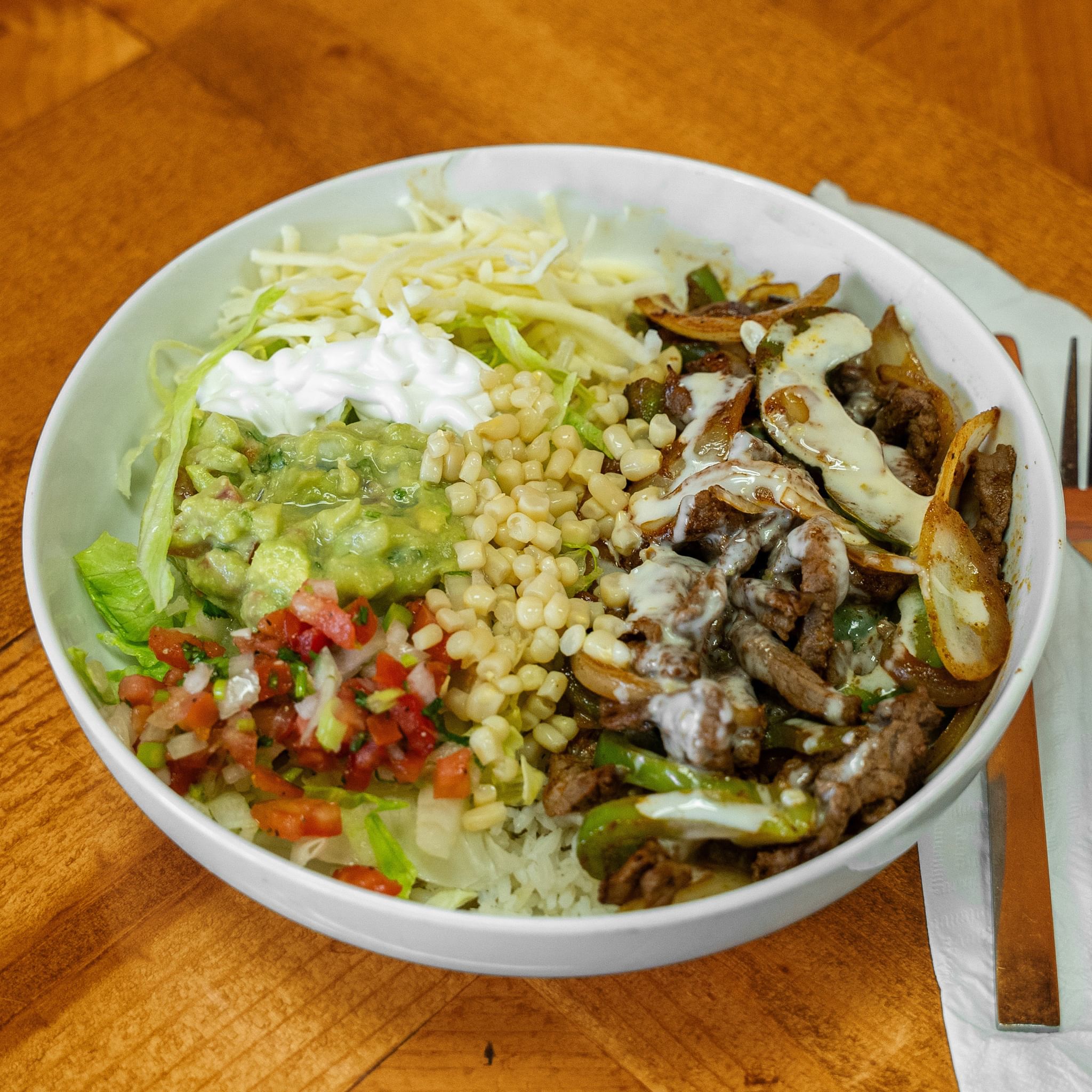 Your choice of freshly grilled meat served in a delicious bowl with rice, beans, fajita veggies and topped with guacamole, corn, white cheese, sour cream, and cheese