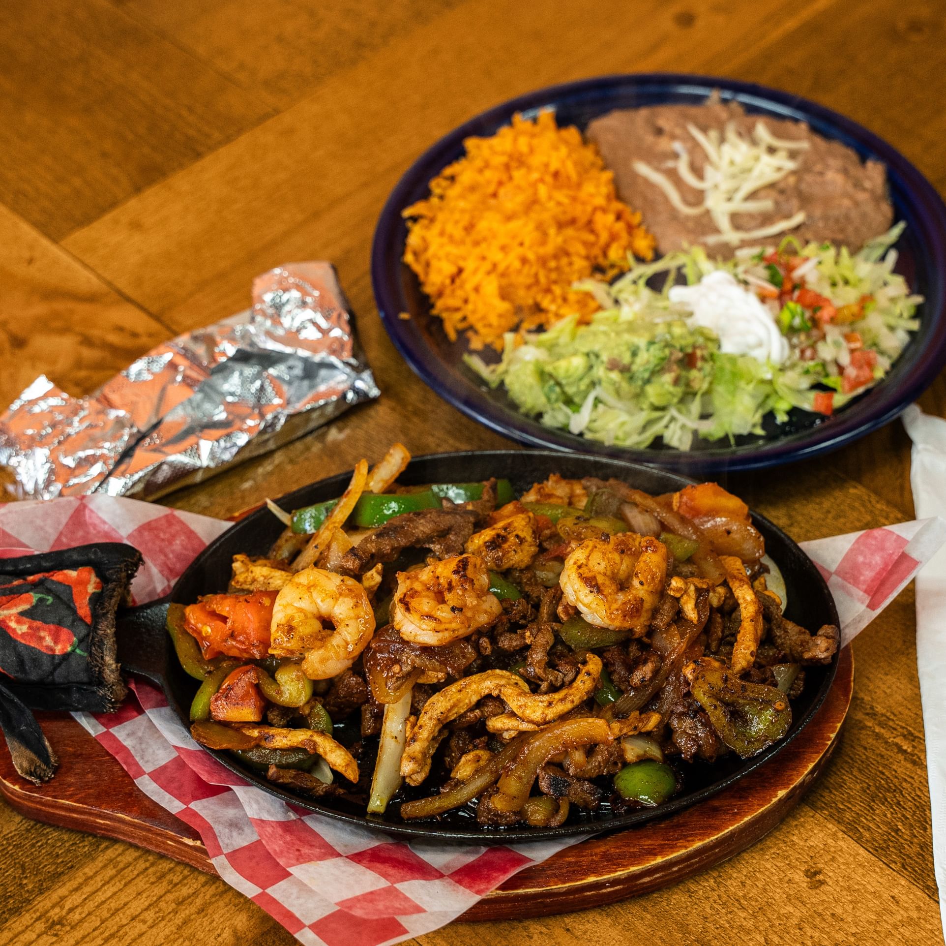 Sizzling shrimp, steak, and chicken cooked with fresh bell peppers, onions, tomatoes. Served with lettuce, guacamole, sour cream, pico de gallo, and tortillas