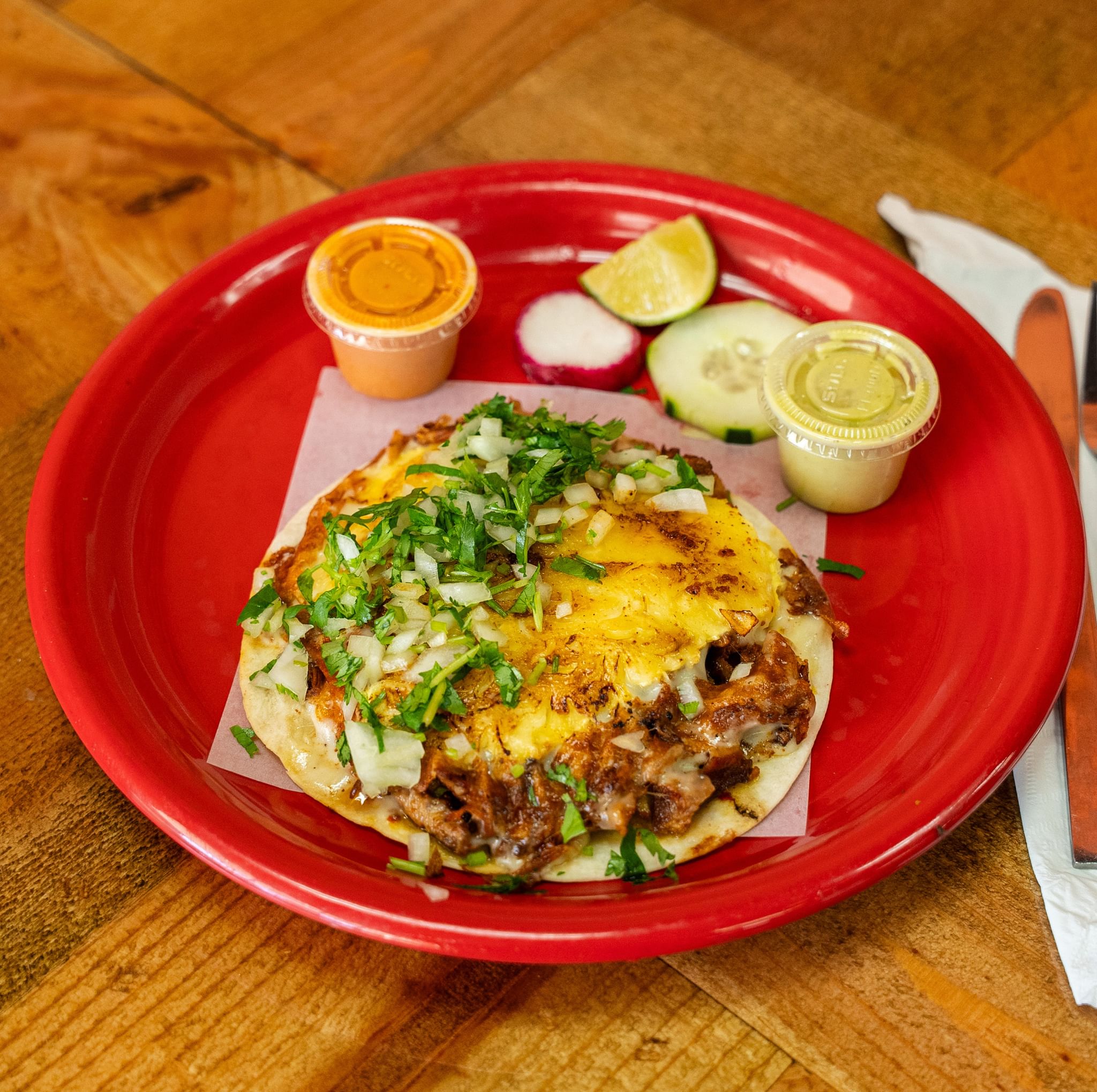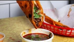 One corn tortilla dipped in beef broth and fried. Filled with melted cheese and birria de res and topped with onions and cilantro. Served with dipping broth. Only one taco
