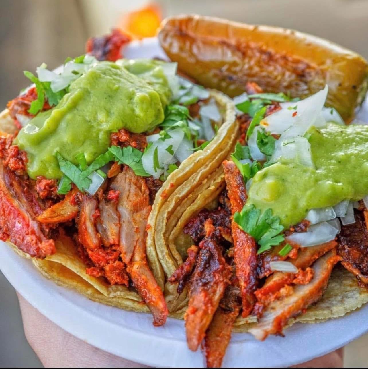 Street Al Pastor Tacos Marinated pork with pineapple on corn tortillas, topped with cilantro, onions, and salsa.
