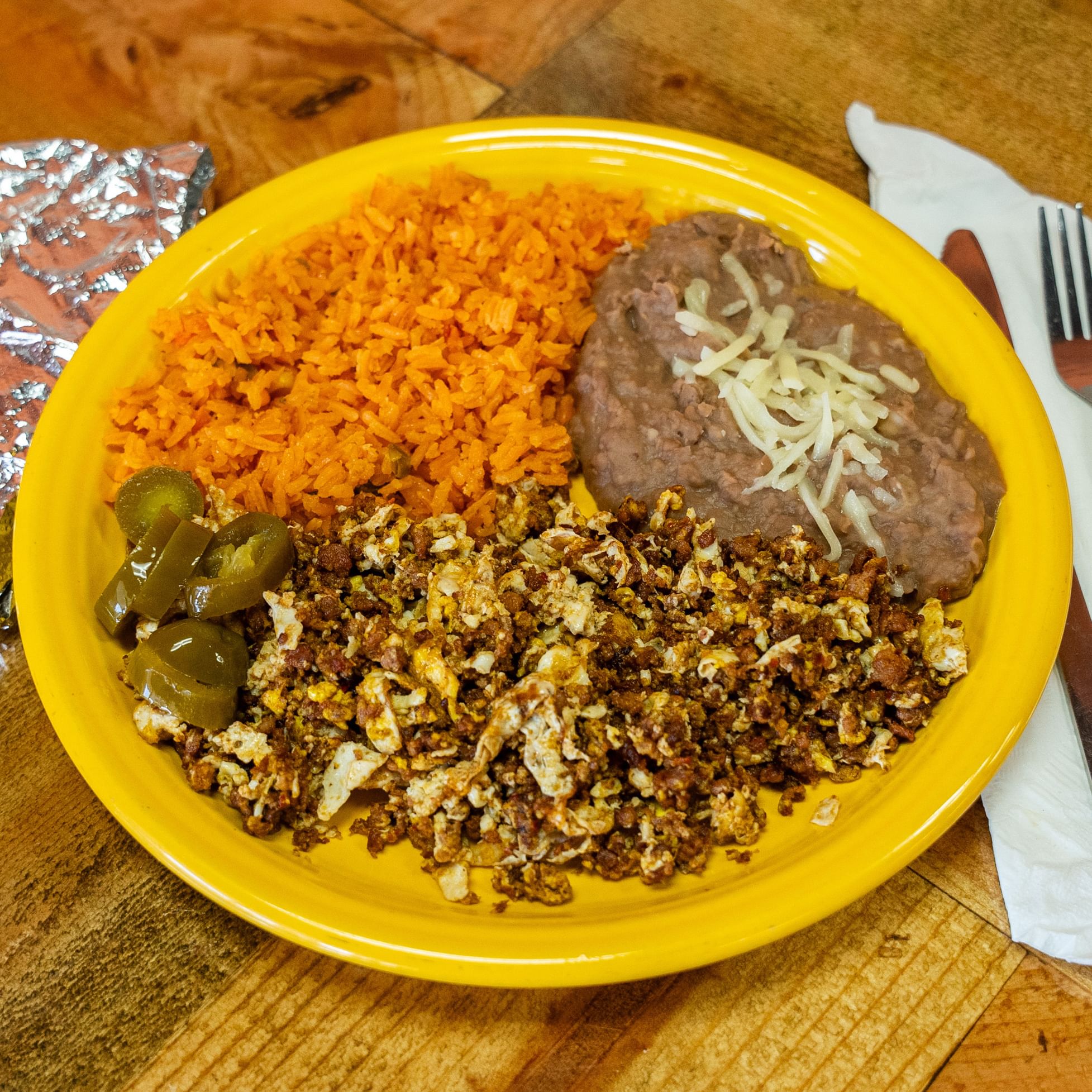 Two scrambled eggs mixed with Mexican pork sausage served with rice, beans, and tortillas