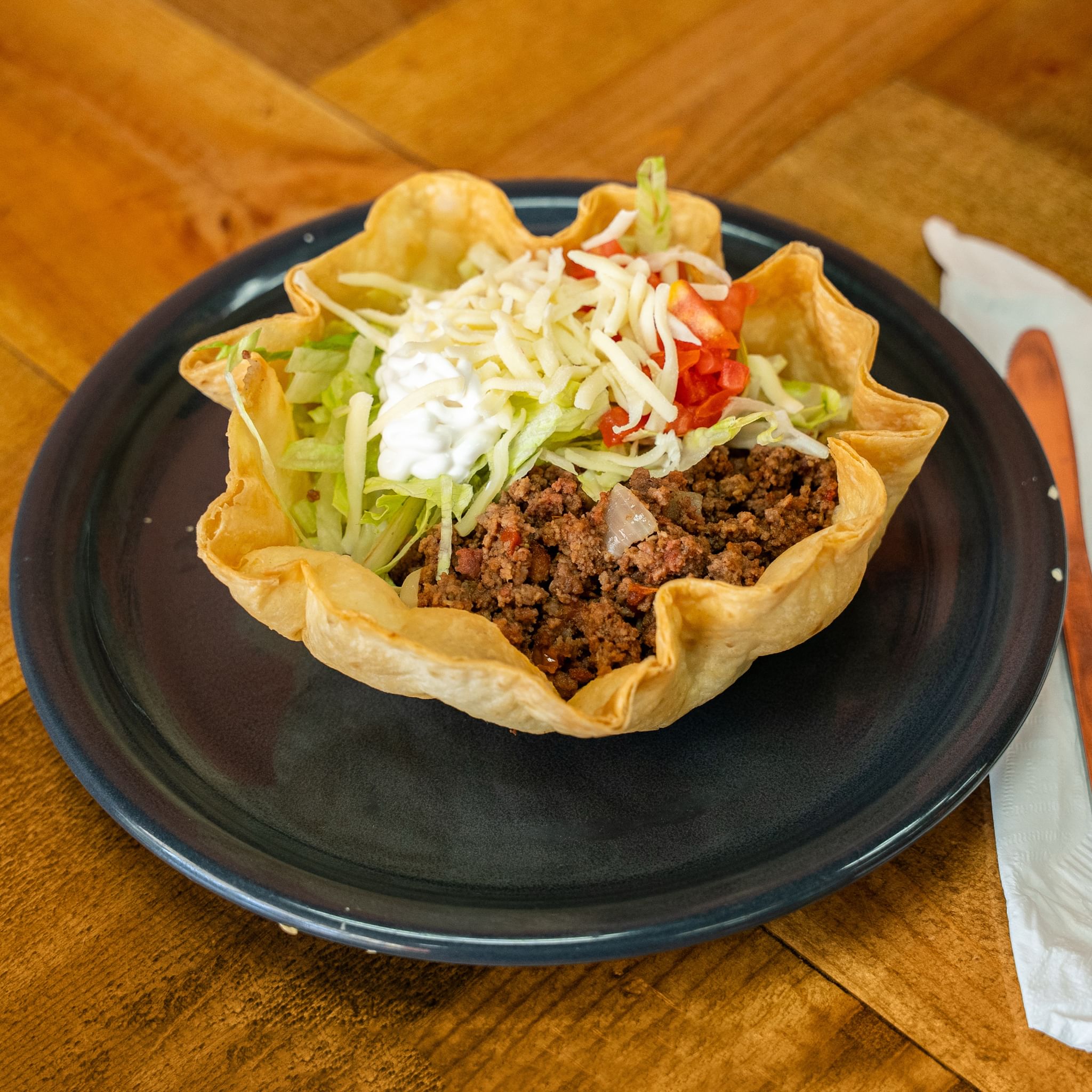 Crispy flour shell filled with your choice of meat. Topped with lettuce, tomato, sour cream, and shredded cheese
