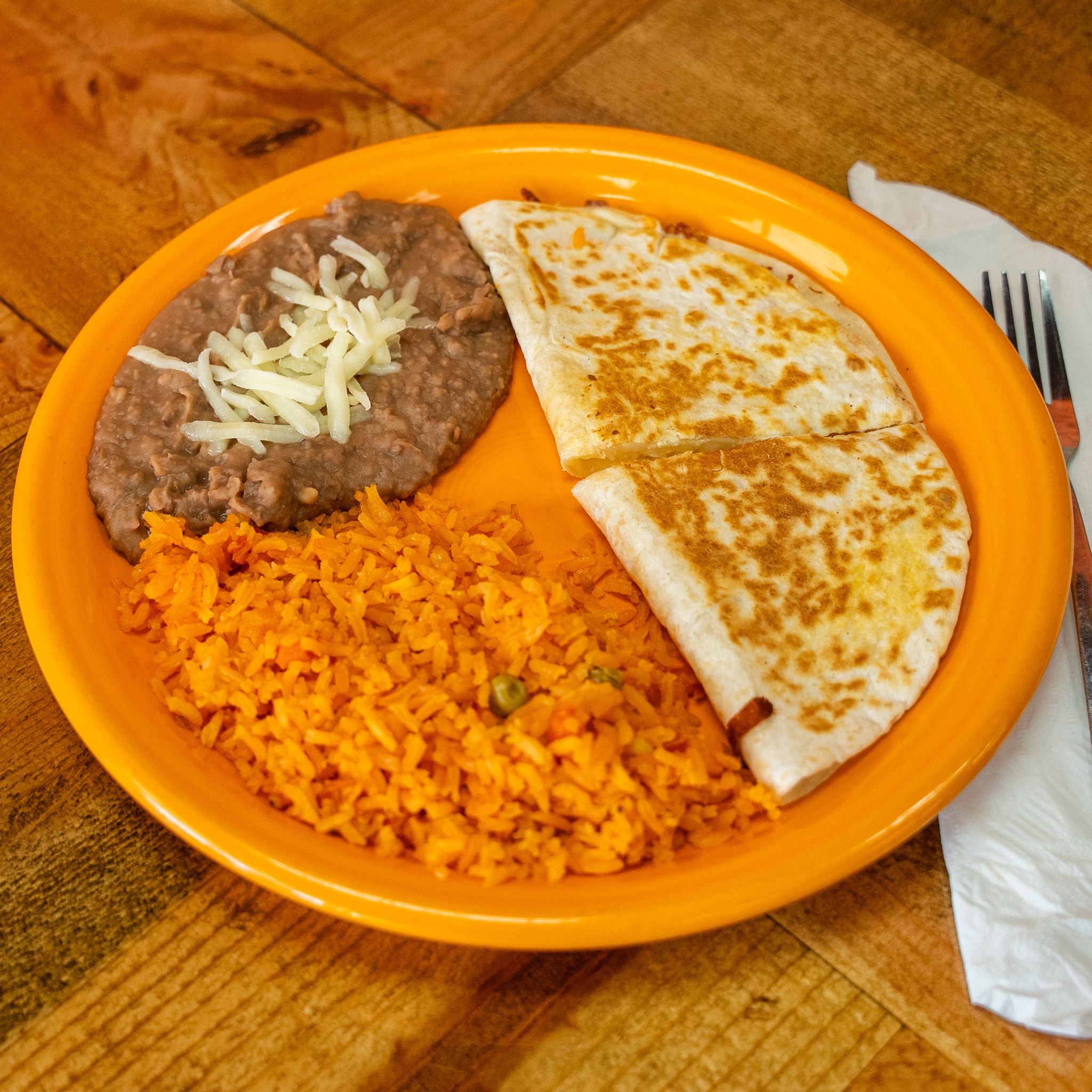 One cheese, beef, or chicken quesadilla served with rice and beans