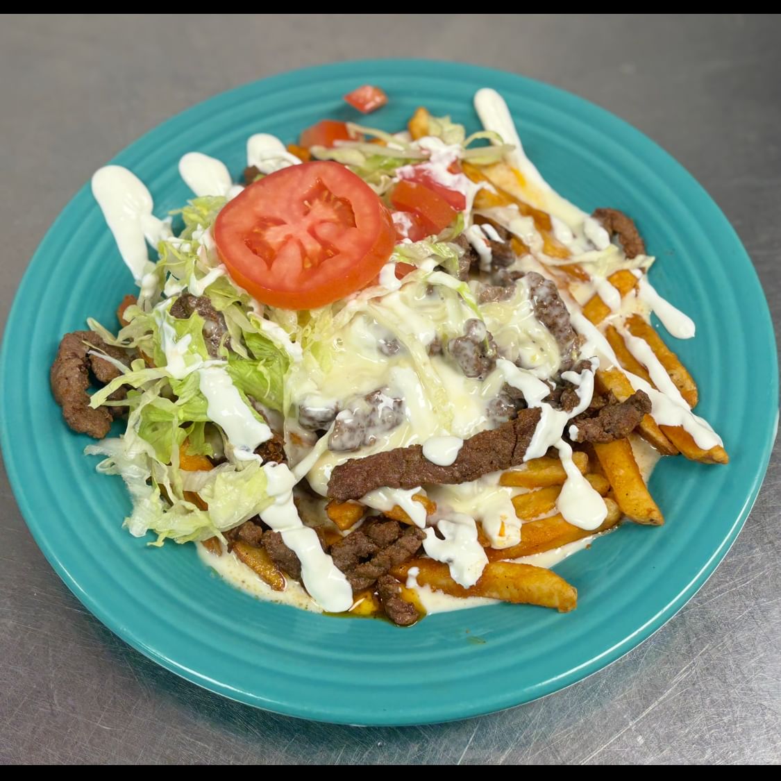 Your choice of one of our flavorful meats on a bed of fries topped with cheese sauce and fresh toppings
