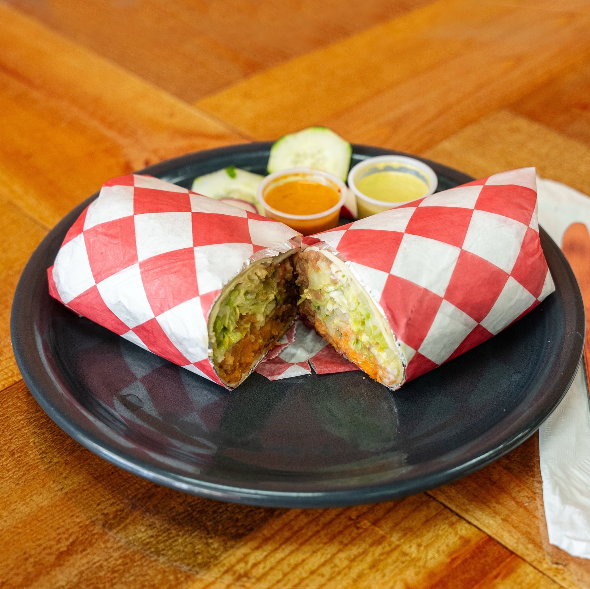 12" flour tortilla loaded with your choice of meat, refried beans, rice, cilantro, onion, pico de gallo, guacamole, cheese and sour cream