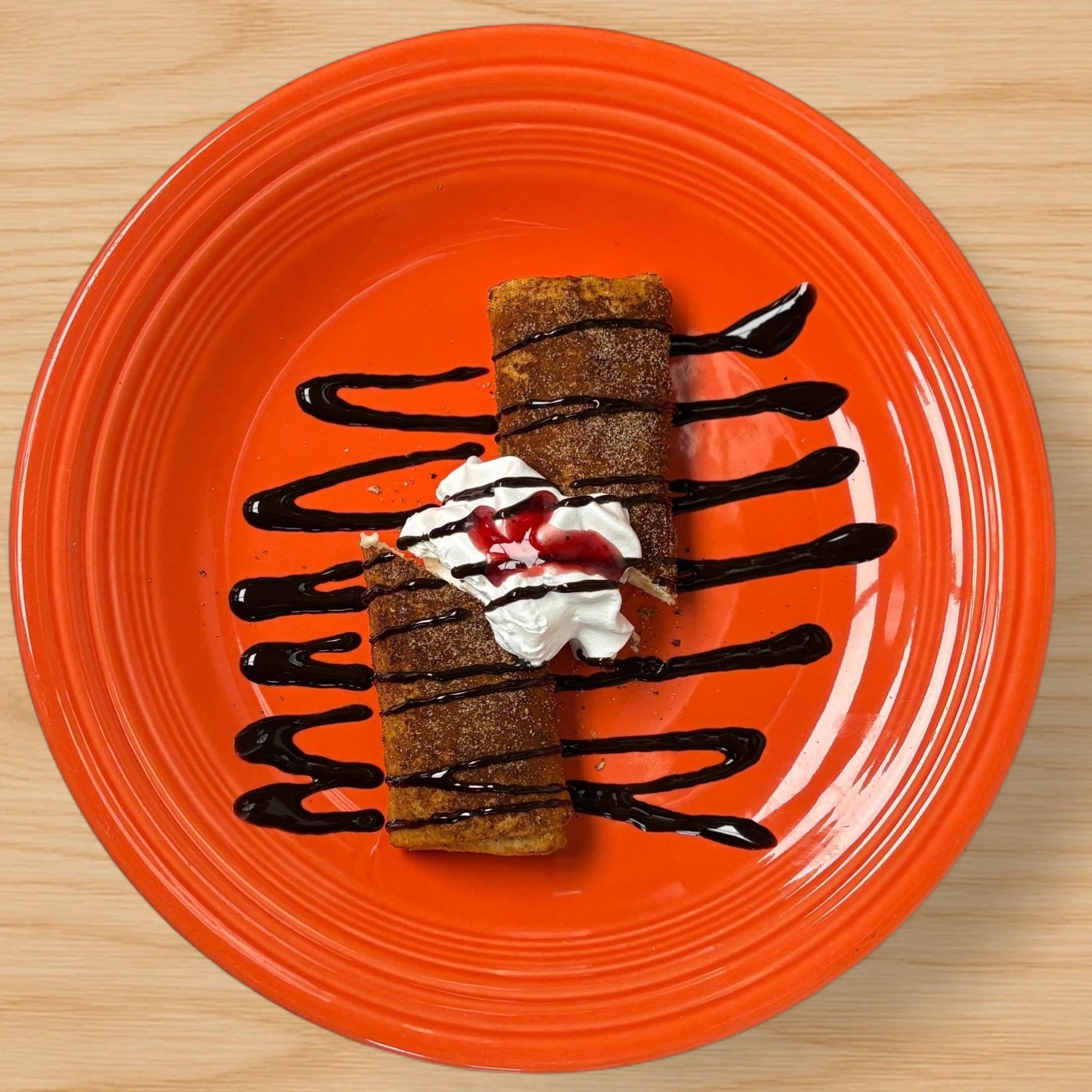 Sweet strip of fried dough dusted with sugar and cinnamon, covered in chocolate syrup and whipped cream