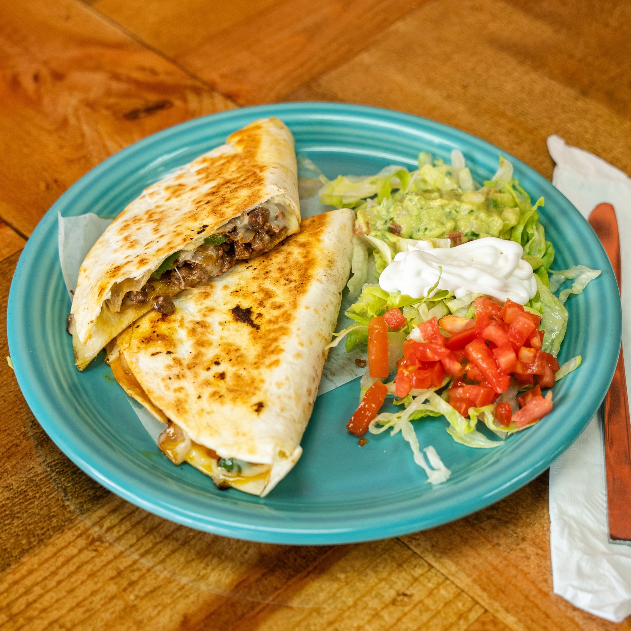 10" flour tortilla with grilled onions, jalapeños and your choice of meat. Served with sour cream, salsa and guacamole