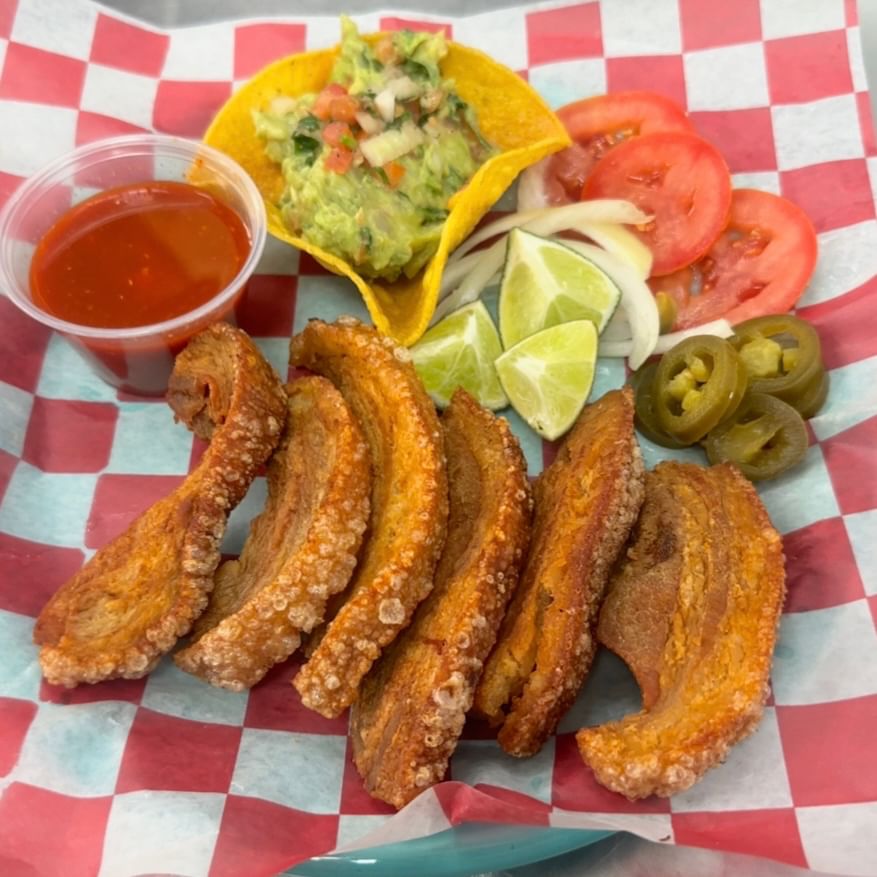 Crispy house-made pork chicharrones served warm with 4 oz of fresh, hand-mashed guacamole and a squeeze of lime.